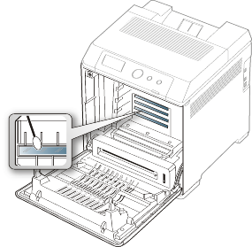 During the printing process, paper, toner, and dust particles can accumulate inside the machine. This buildup can cause print quality problems, such as toner specks or smearing. Cleaning the inside of the machine clears and reduces these problems.