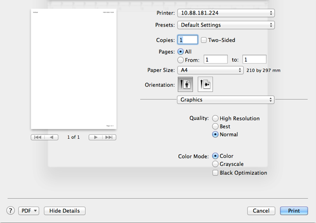 Select various options in the and frames to customize various settings. These options are specific to the printer and depend on the PPD file.