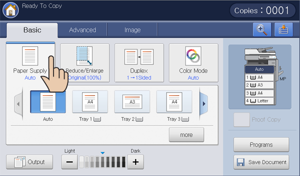 Other preset values: Check the paper size in each tray and press the tray containing the paper size you want.