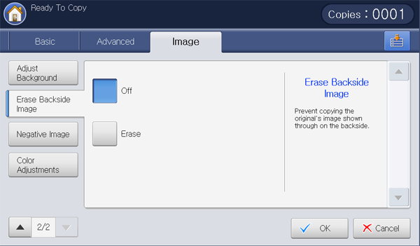 : Prevents copying the original’s image shown through on the backside (see Erasing backside Images).