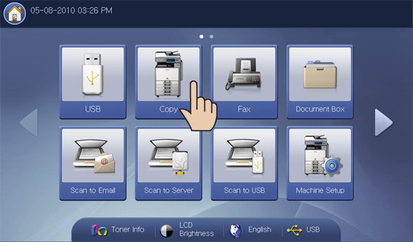 The tab setting is only for the current copy job, which means the selected settings do not apply to the next copy job. After finishing the current copy job, the machine automatically restores the default settings, or when you press the button on the control panel. |